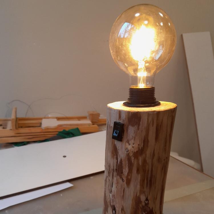 Lampen: Een echte eyecatcher voor iedere tafel, kast of bureau. Een robuuste lamp inclusief lamp en schakelaar. Gemaakt uit 1 stuk hout. De kosten van een lamp is €30,-